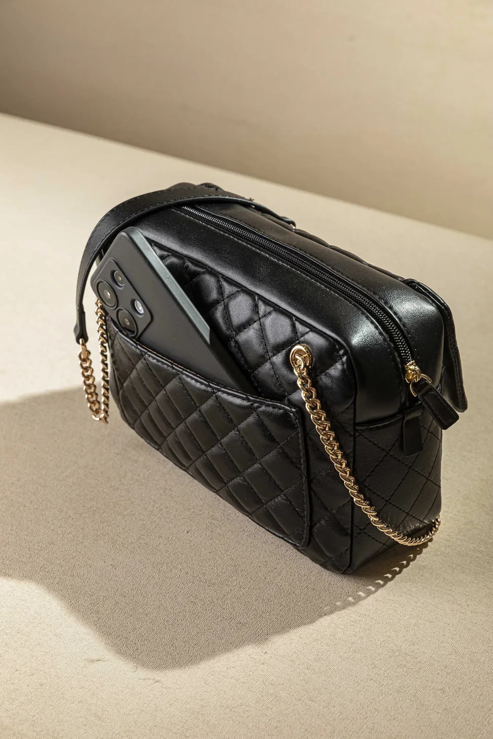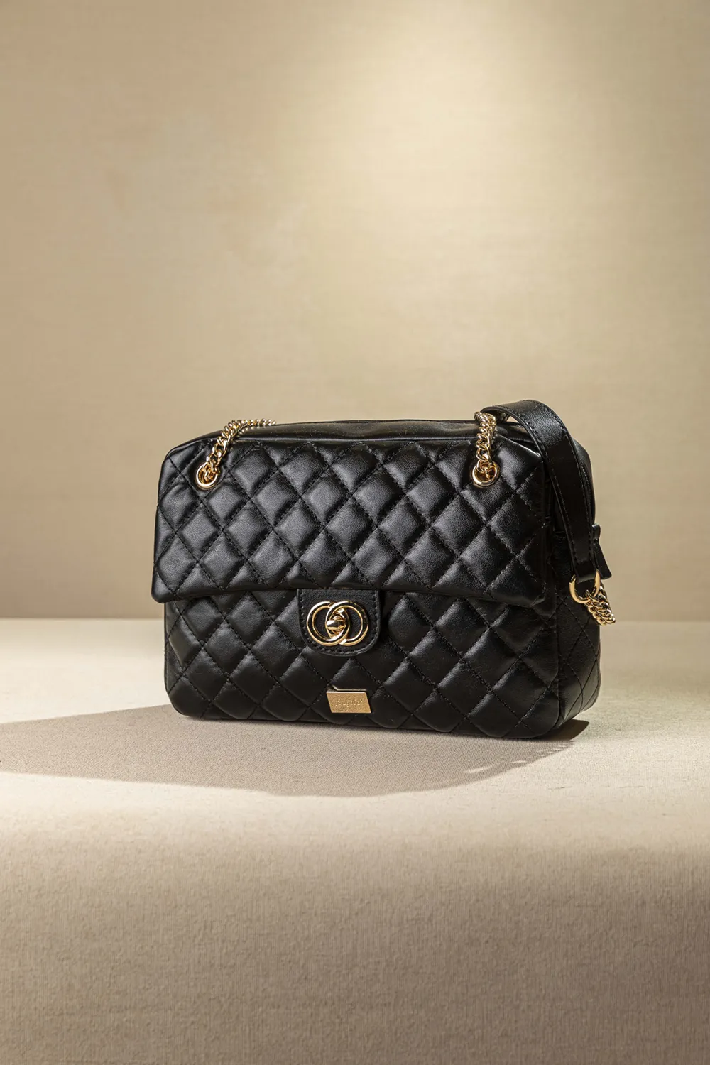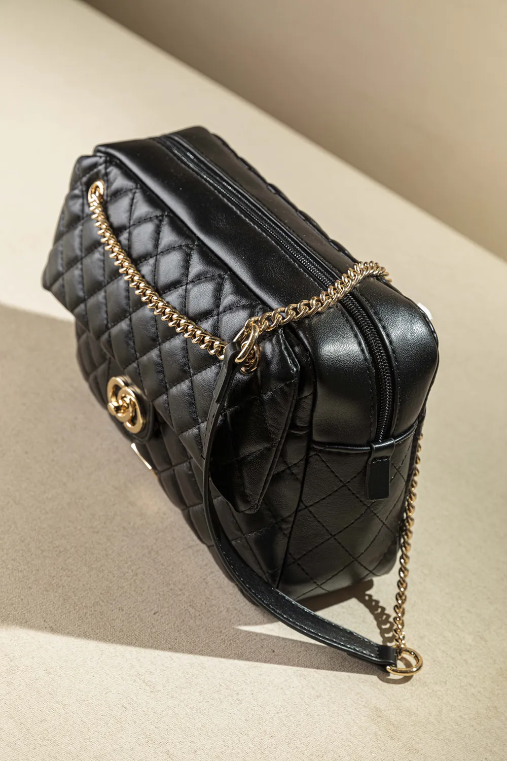 Μια κλασική τσάντα ώμου με τροχισμένη αλυσίδα για τον ώμο.