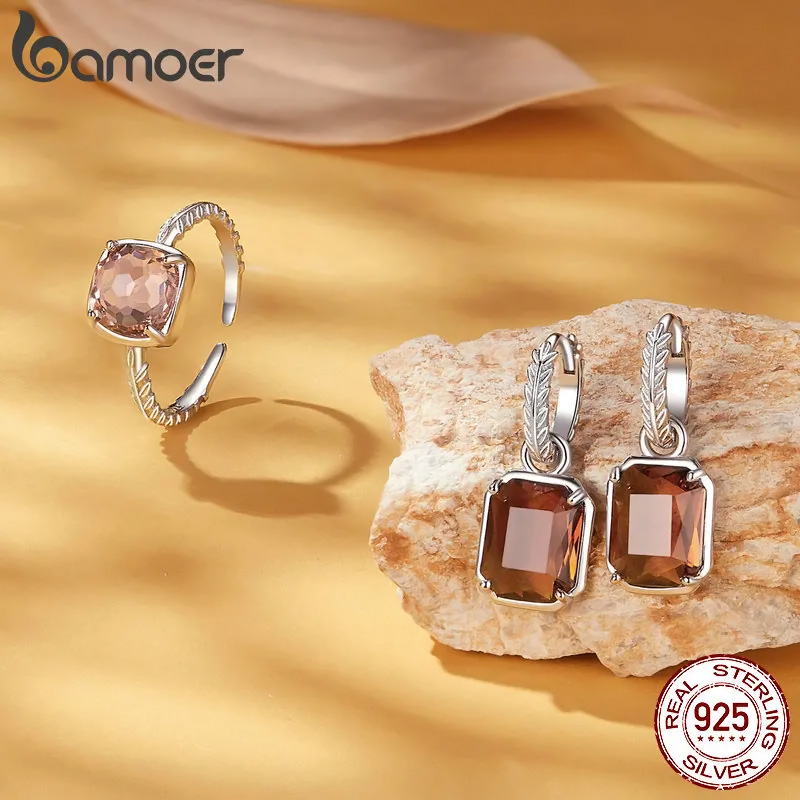 BAMOER δαχτυλίδι BSR598-E με ροζ διάφανο κρύσταλλο, ανοιγόμενο, ασήμι 925, ασημί