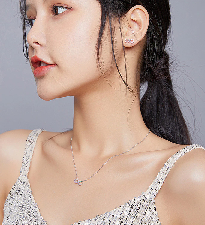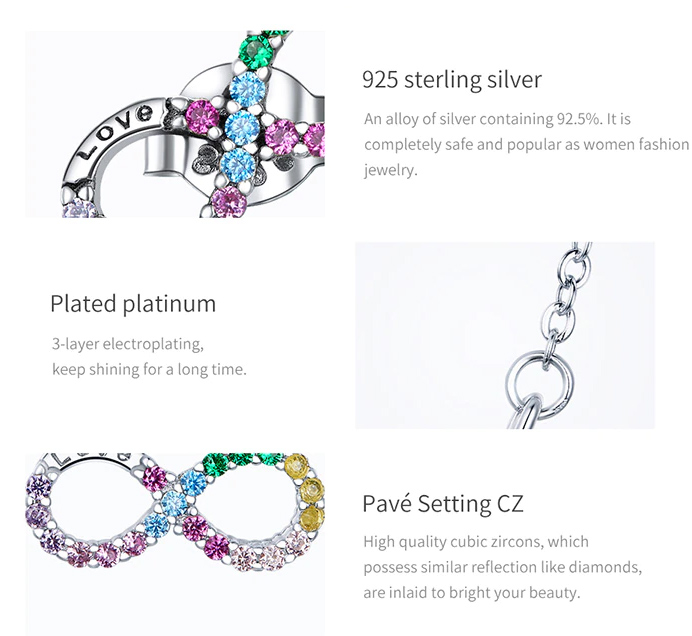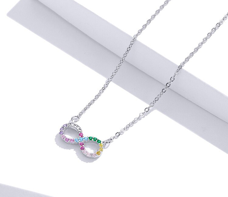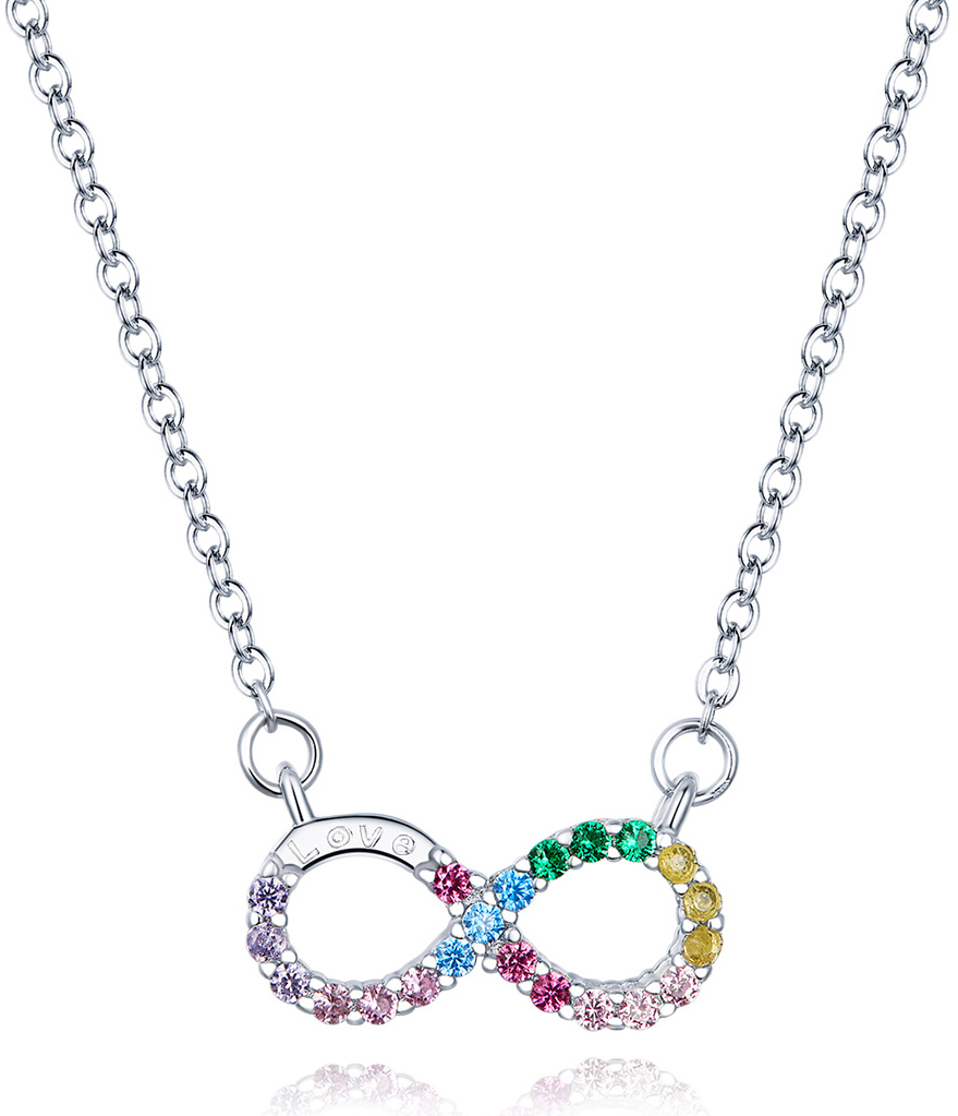 Εντυπωσιακό κολιέ με το σύμβολο του απείρου, σε ασημί χρώμα, διακοσμημένο με κυβική ζιρκόνια σε εντυπωσιακά χρώματα που προσφέρει εξαιρετική λάμψη στο κόσμημα.