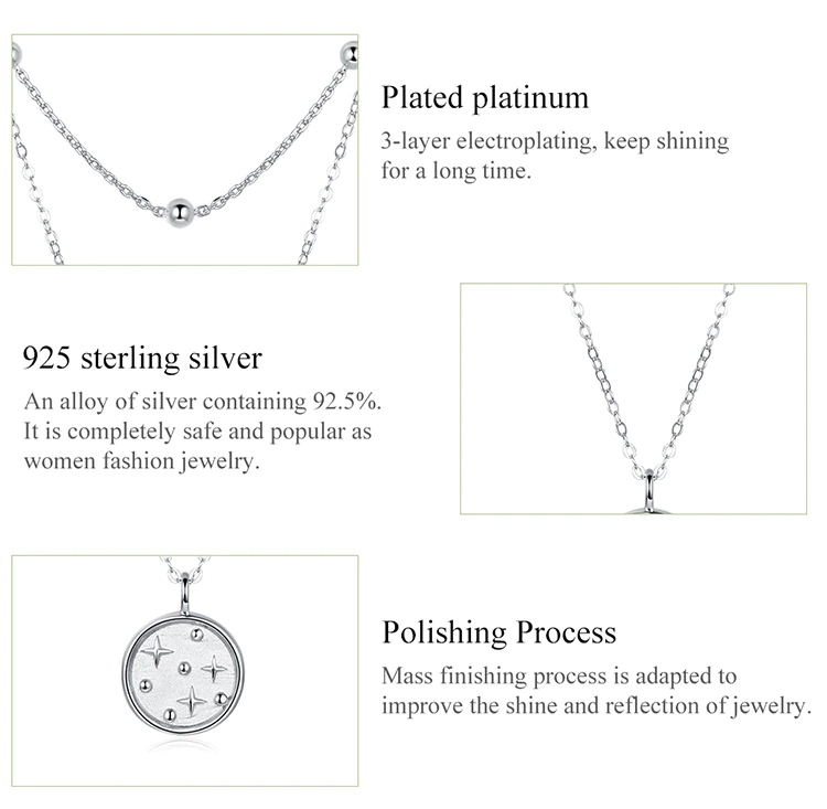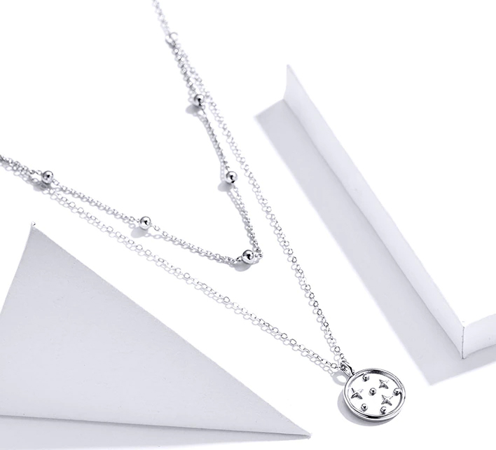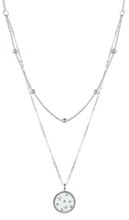 Εντυπωσιακό κολιέ, με ιδιαίτερο και μοναδικό design. Διαθέτει δυο αλυσίδες, η μία διακοσμημένη με μπίλιες και η άλλη με μενταγιόν σε σχήμα κύκλου με μοτίβο αστεριών. Κατασκευάζεται από ασήμι 925 με επιπλατίνωμα.
